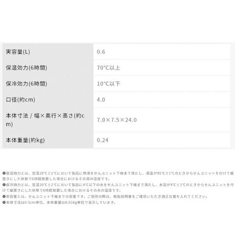 ※保冷効力とは、室温20℃±2℃において製品に4℃以下の水をせんユニット下端まで満たし、