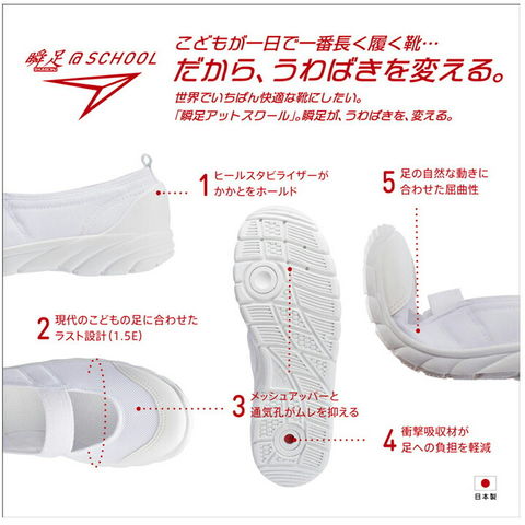 【瞬足アットスクール】はかかと部、足囲、通気性、衝撃吸収性、屈曲性にこだわりぬき、