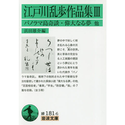 夢の中で妖しく咲き乱れる心象の沃野こそ、真の世界。美と享楽の完全なる人工楽園の建設という夢幻にとり憑かれた青年を描いた代表作「パノラマ島奇談」、戦時下の制約された中で斬新な手法を駆使して書かれた探偵小説「偉大なる夢」の他、7篇を収録。