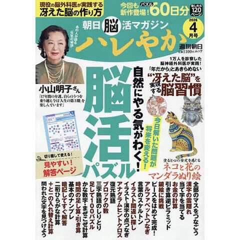 ■衰えない! 健康長寿脳をつくる60日分特製脳活パズル 日本人の平均寿命は女性87歳、男性81歳を超え、どんどん「人生100年時代」が現実になってきています。とはいっても、「健康な100年」でないと今まで通りの生活を楽しむことは困難。元気な脳と体を維持できないとその楽しさも半減します。 これからの快適な生活を実現するための脳活と健康の専門誌『朝日脳活マガジンハレやか』は、自分から進んで解きたくなる漢字・言葉、数字、イラストと多種多様なオリジナルパズルを23種類、60日分120ページ掲載。楽しみながら集中できる飽きさせない問題で脳を活性化します。 認知症対策や食事、運動などの情報や毎号応募者多数の「懸賞ぬり絵」、全国のハレやか読者の声が聞こえる「ハレやか通信」などの人気企画も充実。 好評の巻頭インタビュー「私の元気の秘訣」は、90歳の卒寿を迎えた女優の小山明子さん。夫、大島渚監督への思いと17年間にわたる介護と看取り。その後、がんやうつの発症など、数々の困難を乗り越えてきた人生からライフスタイル、健康、老いとの向き合い方を語ります。