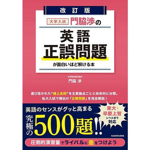 本書では、「入試問題研究オタク」として知られる門脇先生が、2000年度以降に主要大学で出題された「正誤問題」を徹底分析! その中から、選りすぐりの500題を詳細に解説し、「正しい英語」「正しい英文法」への洞察を深められる構成としました。