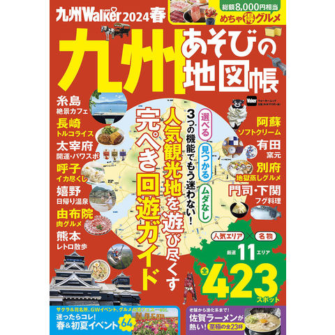 糸島、大宰府など福岡県内の近場から、阿蘇、湯布院、別府といった九州屈指の人気観光地まで全11エリアをピックアップ! 絶対ハズせないご当地グルメを筆頭に、定番の観光名所から、レジャー施設、テイクアウトおやつ、日帰り温泉まで、ぜーんぶマップに落とし込んだ、遊びの最強ガイド決定版。春の休日やGWのおでかけシーズンにたっぷり使える充実の内容となっています。