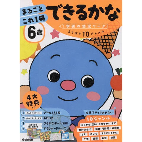 ドリル選びに迷いなし。6歳のおけいこ、よくばり10ジャンル!やっておきたい文字・数・時計に、子どもが大好きな工作・迷路・間違いさがし、ちえ・お金・英語も。おけいこシール・ABCカード・ひらがなボードなど、学びを深めるお得な4大特典つき。