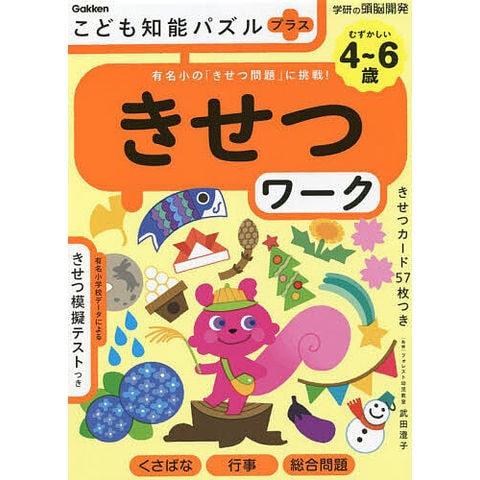 行事・食べ物・植物・生き物に関する季節の知識がしっかり身につく。シールを貼ったり同じ季節のものを探す問題などから季節のポイントがつかめる。季節をテーマにした工作も。小学校受験準備の有名幼児教室監修で、模擬テストと57枚のきせつカードつき。