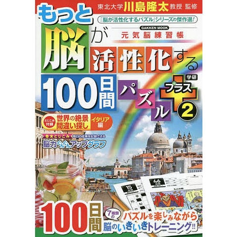 脳トレの第一人者、東北大学の川島隆太教授・監修のロングセラー「脳が活性化するパズル」シリーズの最新刊です。脳の活性化に効果があることが実験を通じてわかった人気のパズル、クロスワード、ナンプレ、間違い探し、漢字ナンクロ等を100問収録。楽しみながら脳の活性化に取り組むことができます。 さらに今シリーズでは巻末とじこみ付録として写真による「世界の絶景 間違い探し」をプラスしました。イラストとは異なり、細部に至るまで奥行きと広がりを持ってリアルに再現されているところが写真による間違い探しの大きな魅力です。その一方で、省略されている部分がないため、違いを見つけるのが大変ということがあります。そこで、本書の付録では、あらかじめ写真を分割し、分割したエリアごとに違いを見つけて解き進めるように工夫。これにより集中力を途切らせることなく、最後まで解けるようになりました。100日間分のパズルに加え、付録で集中力を高めることで、さらに脳トレ効果のアップが見込めます。 世界の絶景写真、今回はイタリアをテーマにしたもので構成しました。ピサの斜塔・コロッセオ・水の都ベネチア・地中海の絶景等々、間違い探しパズルを解きながら旅する気分も味わえるようになっています。楽しみながら、ぜひ脳の活性化に取り組んでください。