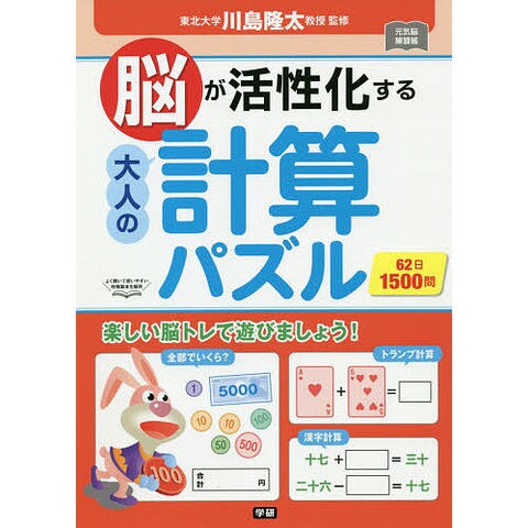東北大学・川島隆太教授の脳トレパズル。楽しく解ける計算パズルを15種類を掲載。おさいふ計算、フルーツ足し算、時間の計算、トランプ計算、三角足し算パズル、買い物パズル、漢字で穴あき計算など、楽しい計算パズルで脳がいきいき活性化!