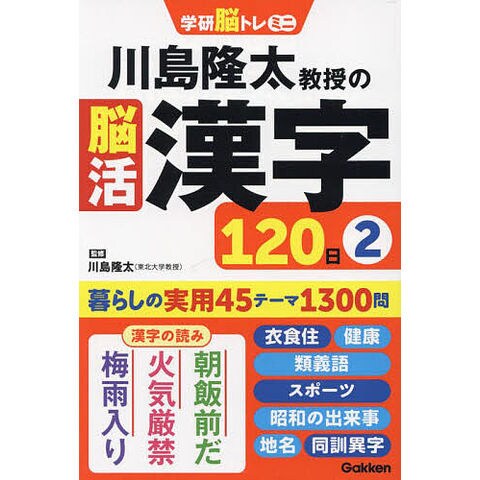 脳トレの第一人者、川島隆太教授の漢字脳トレ第2弾。脳を活性化させる漢字問題を120日分掲載。学校で習った基礎漢字やことわざ・四字熟語・故事成語・慣用句のほか、季節・地名・動物に関する常識漢字など、毎日楽しみながら脳を活性化する。
