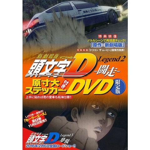 DVD 劇場用アニメーション『新劇場版「頭文字D」Legend2 -闘走-』本編映像(Legend1ダイジェスト+Legend3予告含む66分)、特典映像として初の試み、バトルシーンで徹底検証「原作×新劇場版」収録予定。