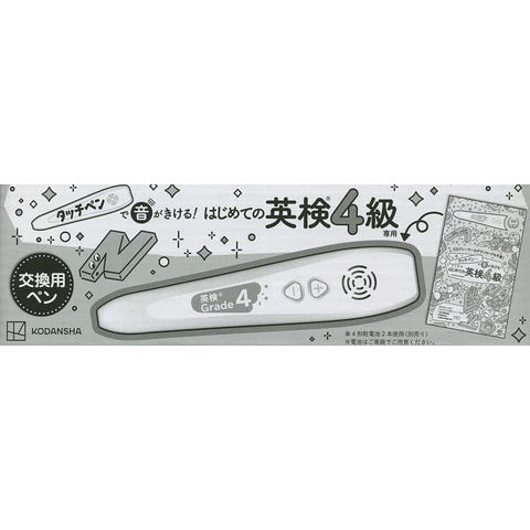 「タッチペンで音がきける! はじめての英検4級」(価格 本体4200円)専用の音声タッチペンです。本品は交換用のペンです。必ず、本体の教本セットを別途ご購入ください。このペンは教本(「はじめての英検4級」)に印刷されている見えないドットコードを読み取って音声が再生されます。このタッチペンのみでは遊べません。また、他の教本をタッチしても反応しません。