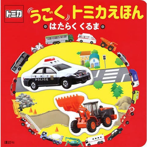 絵本の中のレーンに沿って、コマ状のトミカを動かして遊びます。