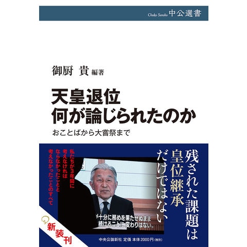 本書は、この3年間に、誰が、どんなことを言ってきたのか、その論点を整理し、積み残した課題を提示するものである。今回の有識者会議(天皇の公務の負担軽減等に関する有識者会議)の座長代理を務めた編者が、3年分の雑誌論文、インタビュー、新聞記事などから、自身の主張とは相容れないものも含めて、意味があると認め、選んだものを論点ごとにまとめて掲載し、それぞれについてコ