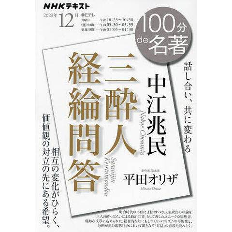 明治時代中期、藩閥政治への不満から民権運動が大きな盛り上がりを見せるなか、その理論的な支柱を作り出そうと奮闘した思想家・中江兆民。代表作『三酔人経綸問答』は民主主義の本質を問う名著だが、ユニークなのはその形式。三人の人物の酒を飲みながらの問答によって進んでいく。理想主義者の洋学紳士と覇権主義者の豪傑君、真っ向からぶつかる二人の議論に、現実主義者の南海先生が示した意外な答えとは――