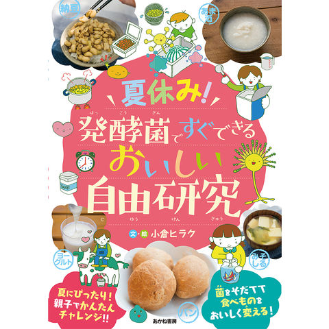 乳酸菌や、納豆菌、酵母菌など、身のまわりにあるけれど、目には見えない発酵菌。これらを夏休み中にそだてて、おいしい食べ物をつくる自由研究ガイド。ヨーグルト、納豆などの手軽なものから、こうじ菌からつくるあま酒や、夏休みいっぱい使って作るみそなどにもチャレンジできる。果物から酵母菌をそだてて、パンまで焼ける。レシピはすべてかわいいイラストでわかりやすく紹介。自由研究のまとめかたも解説している。