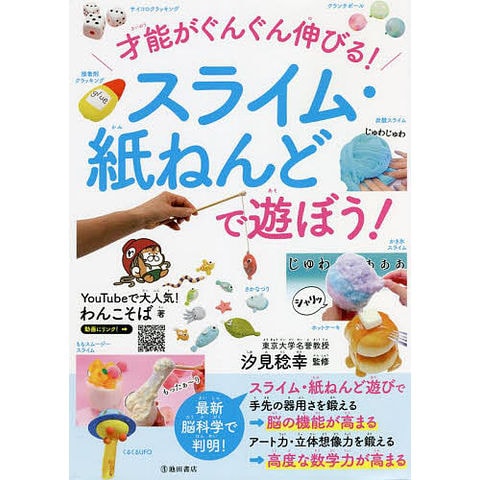 チャンネル登録者数60万人! スライムづくりのYouTube動画で超人気のクリエイター、わんこそばさんによる、みんな大好き「スライム」「ねんど」「紙ねんど」「クレイクラッキング」「スクイーズ」「プッシュポップ」「センサリーボトル」の作り方レシピ。新作動画ももりだくさん。YouTube動画では紹介されない材料や制作のコツがくわしく載っているので、だれでもじょうずに作れる! 教育学の観点から、汐見稔幸・東京大学名誉教授による「脳の発達に効く」解説も掲載。