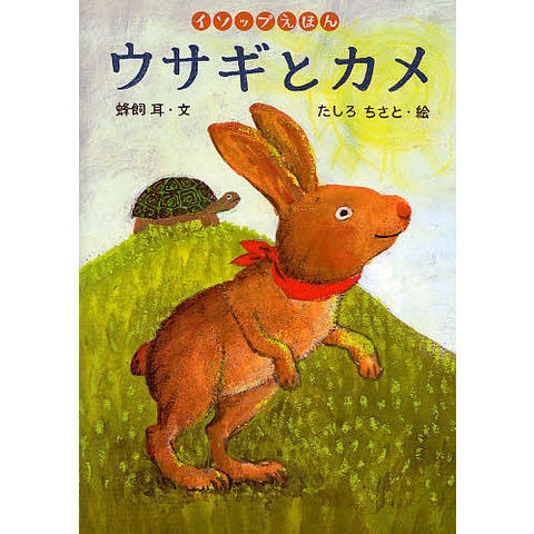 ウサギとカメが競走することになりました。はしりはじめてしばらくするとウサギはうしろがきになりふりかえってみました。カメのすがたはまったくみえません。「あ、にんじんだ。おいしそう」。ウサギはにんじんばたけで寝てしまいます。するとカメが…。