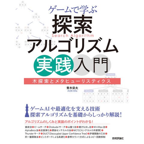 ゲームAIの技術要素には大きく分けて「ルール」「探索」「機械学習」の3つがあります。近年話題になることの多い機械学習ですが、機械学習だけでは遠い将来の状況を正確に読むことは難しく、特に探索がなければ真に強いAIは生まれません。また、ゲームAIの技術を競う各種コンテストなどでは使用できるメモリ量やファイルの容量に制限が課され、機械学習を利用することが現実的ではないケースもあります。これは実務においても同様で、与えられた要件によっては今も探索技術が主要素となり得ます。本書は、この探索技術とそれを支えるアルゴリズムにフォーカスを当て、ゲームAIを題材にその重要性と魅力を楽しく学ぶための入門書です。さまざまなゲームの種別に対応した探索アルゴリズムについて、動作のしくみと実装方法を丁寧に解説します。