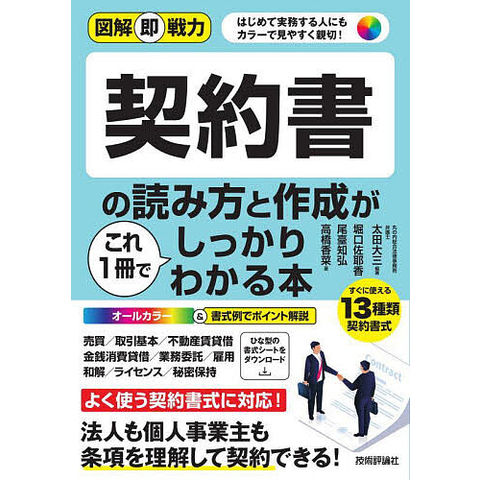 オールカラーではじめての人にもやさしい、契約書の読み方と作成がしっかりわかる教科書です。中小の会社や個人でも契約書は日常的に締結します。契約の責任者・当事者となったら、条文の内容を理解し、必要な条項を置いておくことが大切です。この本は契約書の構成や読み方を基礎から説明し、代表的な取引ケースの契約書式を掲載して、条項ごとに読み方と作成のポイントを解説しています。取引基本契約書、賃貸借契約書、消費貸借契約書、業務委託契約書、雇用契約書、和解契約書、ライセンス契約書、秘密保持契約書など、実務にすぐ役立つ契約書式13例を掲載。法律の専門家でなくても、あとからトラブルや損害が発生しないように、しっかりと内容を精査した契約書を交わすことができます。(契約書式ひな型のダウンロードサービス付き)