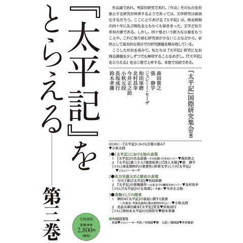 第三巻では第一章「『太平記』における知の表現」、第二章「有力守護大名と歴史の表現」、第三章「書物としての探求」の三章を設け、六篇の論文と三篇のコラムを収録。執筆は森田貴之/張 静宇/ジェレミー・セーザ/和田琢磨/北村昌幸/今井正之助/小秋元段/長坂成行/鈴木孝庸。巻末には六篇の論文の英語・中国語・韓国語の要旨も収載。「二〇一五年度『太平記』研究国際集会」での研究発表をもとにした論集です。