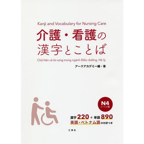 介護・看護に特化した漢字のワークブック。ベトナムのEPA来日前研修の教材をベースに、学習者のレベルを初級(N4)に絞り、実際に現場で使われていることばやフレーズから語彙や漢字を抽出し、使用頻度の高いものから効率的に勉強できるように組み立てている。漢字220、語彙890を収録。英語とベトナム語の対訳つき。