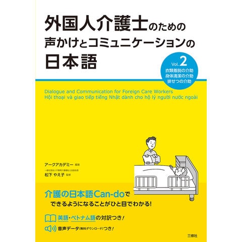 本書には「衣類着脱の介助」「身体清潔の介助」「排せつの介助」の声かけ表現が掲載されています。「あいさつ」「移乗・移動の介助」「食事の介助」が掲載されているVol.1とあわせて学ぶことで、効果的に、介護現場での基本的な声かけを習得することができます。英語・ベトナム語の対訳つき。日本語能力試験N4レベル相当の方に。