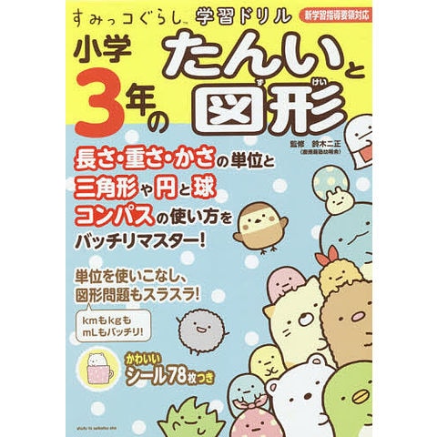 大人気の「すみっコぐらし」のキャラがいっぱい。ぐっと難かしくなる長さや重さの単位換算、図形の性質などを学習。シール付き。