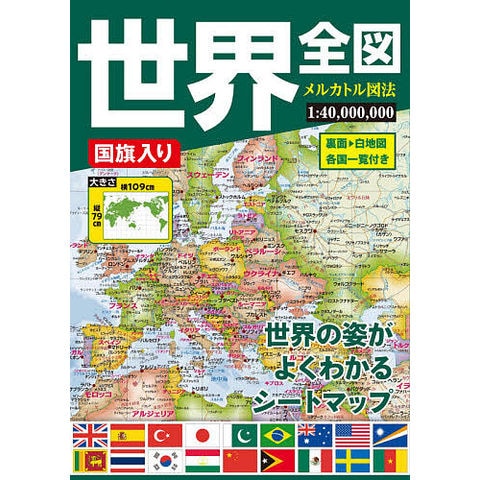 刻々と変化する世界情勢を的確に把握できるように編集した、タテ79cmヨコ109cmのメルカトル図法によるシートタイプ世界全図。各国の国旗が地図を取り囲みます。裏面は白地図になっており、書き込みに便利です。折り畳んでケースに入れることができます。