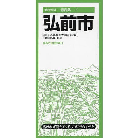 弘前市の主要部を1 25、000図で、全域を1 200、000図で収録しています。さらに弘前市の中心部をより詳しい1 10、000図で収録しています。裏面には町名索引と施設索引を収録し、役所、官公署、公共施設、学校などの検索に便利です。
