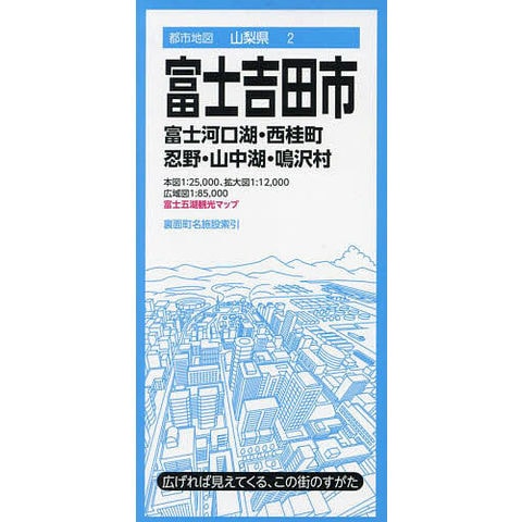 富士吉田市、富士河口湖町、西桂町、忍野村、山中湖村、鳴沢村の全域を広域図1 85、000図で、主要部をより詳しい1 25、000図で収録しています。富士吉田市の中心部はさらに詳しい1 12、000図で収録しています。