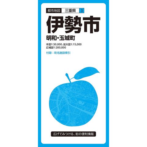 山間部を含む伊勢市及び明和・玉城町全域を1 200、000図、当該メインエリアを1 30、000図、伊勢市中心部をより詳しい1 15、000図で収録しています。裏面は書き込んで使える白地図となっています。別冊付録には町名索引と施設索引を収録し、役所、官公署、公共施設、学校などの検索に便利です。