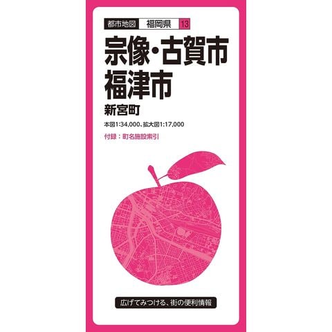 宗像市、古賀市、福津市、新宮町の全域を1 34、000図、中心部を1 17、000図で収録しています。点在する離島は位置関係を把握できるように広域図を設けました。裏面は書き込んで使える白地図となっています。別冊付録には町名索引と施設索引を収録し、役所、官公署、公共施設、学校などの検索に便利です。