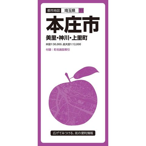 本庄市および美里町、神川町、上里町の全域を1 30、000図で、本庄市中心部をより詳しい1 12、000図で収録しています。裏面は書き込んで使える白地図となっています。別冊付録には町名索引と施設索引を収録し、役所、官公署、公共施設、学校などの検索に便利です。
