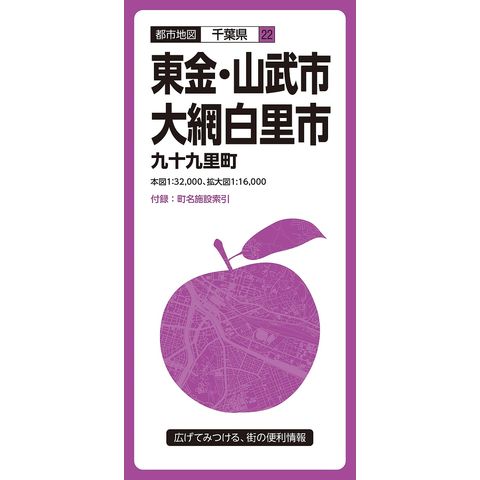 東金市、山武市、大網白里市、九十九里町の全域を1 32、000図で、東金市、山武市、大網白里市の中心部をより詳しい1 16、000図で収録しています。裏面は書き込んで使える白地図となっています。別冊付録には町名索引と施設索引を収録し、役所、官公署、公共施設、学校などの検索に便利です。