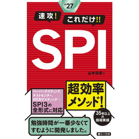 SPI3試験に向け、対策すべき重要なポイントを最短で効率よくおさらいできる1冊です。非言語分野のはじめに実力をチェックすることのできる、実力確認ミニテストを掲載。また、各項目には頻出度・難易度(正解率)がひとめでわかるアイコンがついているので、学習しやすい。超速解法のコツを挙げ、ハンディ版ながら解説も丁寧。丁寧に解説。赤シートつき。