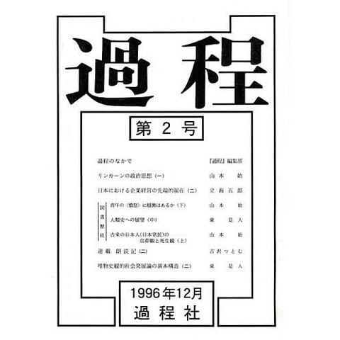 思想・学問誌『過程』は、社会・人文の分野において学問的・思想的な真理を探究した本格的な論文を収録した自立誌である。社会&人文の分野における本質的な諸課題に本格的に取り組んだ論文を編集。戦後五一年(西暦一九九六年一二月)に発行した第二号は、1.ソ連崩壊後の社会主義の現在を論じた架空座談録、2.第二次大統領就任演説の吟味を軸にリンカーンのアメリカ連邦観を解明した論文、3.石川馨『日本的品質管理』の品質保証・全社的品質管理を批判的に概観した論文、4.宍戸恭一の見解を介して青年の〈憤怒〉には根拠があることを論じたノート、5.渡辺京二『なぜいま人類史か』のレビュー、6.柳田国男『先祖の話』を基に古来日本人の信仰・死生観を考察したノート、7.朗読の研究記録(向田邦子と太宰治の作品朗読から三浦つとむの言語論・認識論との関連について)、8.『唯物史観的社会発展論の基本構造』の「マルクス所有論」部分の連載。