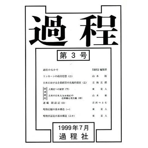 思想・学問誌『過程』は、社会・人文の分野において学問的・思想的な真理を探究した本格的な論文を収録した自立誌である。社会&人文の分野における本質的な諸課題に本格的に取り組んだ論文を編集。戦後五四年(西暦一九九九年七月)に発行した第三号は、1.加藤典洋『敗戦後論』の批判的吟味を介して日本の「ねじれ」構造を論じた架空座談録、2.アメリカ南北戦争の原因を論じた論文、3.日本のTQC的「人間性尊重の経営」を批判的に吟味した論文、4.渡辺京二『なぜいま人類史か』のレビュー、5.柳田国男『先祖の話』を基に古来日本人の信仰・死生観を考察したノート、6.朗読の研究記録(志賀直哉と三浦哲郎の作品の朗読練習を通した「場面の転換」の研究)、7.『唯物史観の基本構造』における解明の方法論と「生活生産論」部分の『試行』投稿論稿、8.『唯物弁証法の基本構造』の「毛沢東矛盾論批判」の部分の連載。