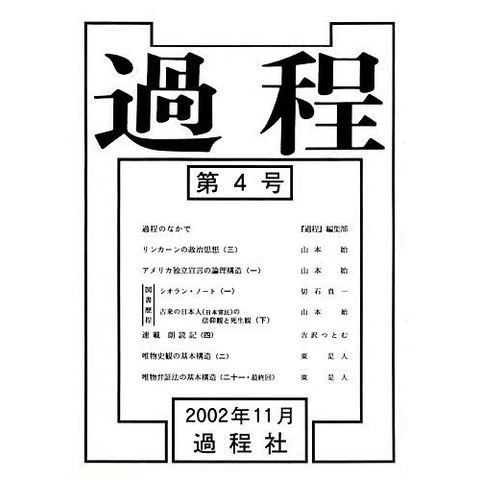 思想・学問誌『過程』は、社会・人文の分野において学問的・思想的な真理を探究した本格的な論文を収録した自立誌である。社会&人文の分野における本質的な諸課題に本格的に取り組んだ論文を編集。戦後五七年(西暦二〇〇二年一一月)発行の第四号は、1.大東亜太平洋戦争を主導した天皇制イデオロギーの「ねじれ」構造を論じた架空座談録、2.アメリカの奴隷制度をめぐる政治的亀裂の推移を論じた論文、3.アメリカ独立宣言の論理構造について古田武彦(日本古代史論に革命を起こした人物)と論争した往復書簡、4.シオラン(ルーマニアの作家&思想家)に関する思想的ノート、5.柳田国男『先祖の話』を基に古来日本人の信仰・死生観を考察したノート、6.朗読の研究記録(芥川龍之介の『トロッコ』について)、7.『唯物史観の基本構造』における「生活生産論」部分の『試行』投稿論稿の採録、8.『唯物弁証法の基本構造』の連載最終回分。