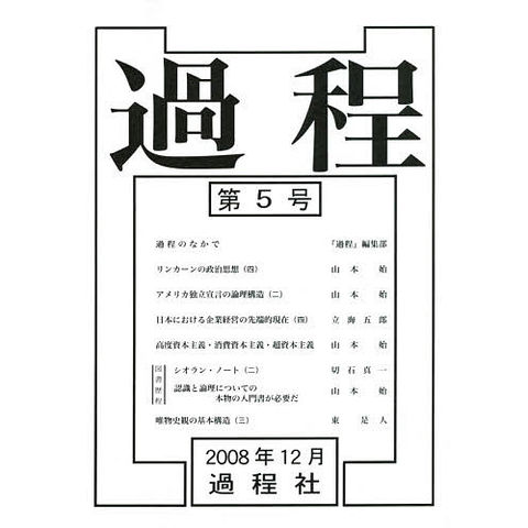 思想・学問誌『過程』は、社会・人文の分野において学問的・思想的な真理を探究した本格的な論文を収録した自立誌である。社会&人文の分野における本質的な諸課題に本格的に取り組んだ論文を編集。戦後六三年(西暦二〇〇八年一二月)発行の第五号は、1.明良佐藤の加藤典洋『敗戦後論』批判を吟味し大東亜太平洋戦争を総括する基本的な立場と視点を論じた架空座談録、2.アメリカ南北の分裂の推移を論じた論文、3.アメリカ独立宣言の論理構造について古田武彦(日本古代史論に革命を起こした人物)と論争した往復書簡、4.日本のTQC的経営思想の意義と限界を論じた論文、5.吉本隆明の高度資本主義・消費資本主義・超資本主義論を吟味した論文、6.シオラン(ルーマニアの作家&思想家)に関する思想的ノート、7.板倉聖宣著『日本史再発見』『新哲学入門』の書評、8.『唯物史観の基本構造』における「交通論」の『試行』投稿論稿。