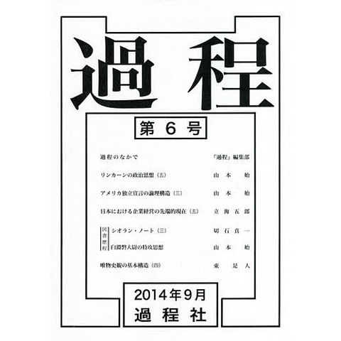 思想・学問誌『過程』は、社会・人文の分野において学問的・思想的な真理を探究した本格的な論文を収録した自立誌である。社会&人文の分野における本質的な諸課題に本格的に取り組んだ論文を編集。戦後六九年(西暦二〇一四年九月)発行の第六号は、1.戦後六八年末時点から直近五年間に発生した重要な出来事(吉本隆明の死去、マスコミの反「小沢一郎」キャンペーン、北朝鮮・中共の動向、東日本大震災と福島原発大人災など)を論じた架空座談録、2.リンカーンの大統領選出と南北戦争の勃発を論じた論文、3.アメリカ独立宣言の論理構造をめぐって古田武彦(日本古代史論に革命を起こした人物)と論争した際の往復書簡、4.シオラン(ルーマニアの作家&思想家)に関する思想的ノート、5.吉田満『戦艦大和』を介した臼淵磐大尉の特効思想への評論、6.『唯物史観の基本構造』における「交通論」「市民社会論」部分の『試行』投稿論稿。