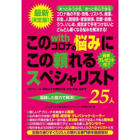 人間関係の悩みも生じています 。コロナは、さまざまな解決すべき悩みをもたらしました。そこで、この変化の時代の悩みにこたえる、日本各地の選りすぐりの悩み解決スペシャリスト25名の先生が登場です。プロフィール・相談者の声・理念・考え方・連絡先、メールアドレス、ホームページ、料金、お顔写真も掲載しております。