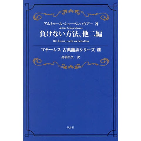 大好評マテーシス古典翻訳シリーズ第八弾は、アルトゥール・ショーペンハウアーの『負けない方法、他二編』です。全体の見直しと大幅な脚注に加え、『思索について』と『読書について』を収録しました。本作は高橋氏による初邦訳であり、これまでに知られていなかったショーペンハウアーの欧米で最も読まれている作品の一つをお楽しみください。