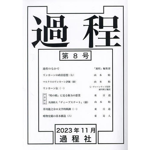 本誌『過程』は、社会&人文学の分野における本質的な諸課題に取り組み、その分野において学問的・思想的な真理を獲得したと思われる論文を収録した自立誌である。戦後78年(西暦2023年11月)に発行した最新の第8号は、1 西暦2015年10月14日に亡くなった日本古代史研究家・古田武彦との学問的交流について論じた架空座談録、2 リンカーンの「第一次大統領就任演説」と「戦争教書」の解読によって、リンカーンの南北戦争論を考察した論文、3 マルクスのリンカーン評価を分析し、マルクスとリンカーンの政治思想を比較&検討した論文、4 L・チャーンウッド原作『リンカーン伝』の翻訳、5 ジョセフィン・テイ原作『時の娘』と馬渕睦夫『ディープステート』についての書評、6 芥川龍之介の文学的軌跡を体系的に分析した論文、7 マルクス&エンゲルスの唯物史観の基本構造を解読&復元し、従来の解釈を根底から批判した論文、を掲載