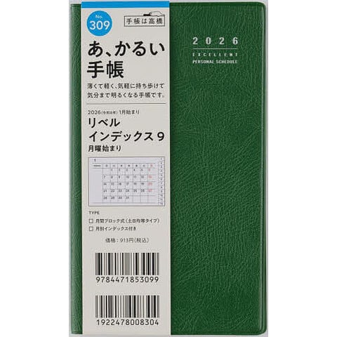 リベル インデックス 9 月曜始まり [フォレストブルーグリーン] 手帳判 マンスリー2026年1月始まり No.309