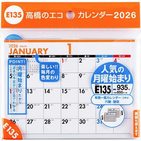エコカレンダー卓上A6(月曜始まり) E135 2026年版1月始まり
