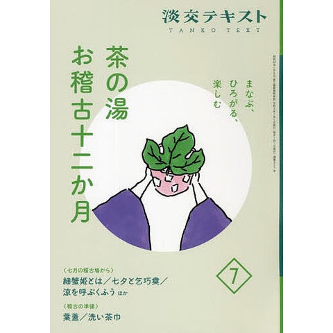 2022年の淡交テキストは毎月の稽古場で出会うモノ、コトから、茶の湯のまなびや楽しみをひろげるシリーズです。《7月の稽古場から》《稽古の準備》では、稽古場風景と「葉蓋・洗い茶巾」の準備を取り上げた上で、それらに関連する「細蟹姫とは・七夕と乞巧奠・涼を呼ぶくふう・葉蓋に適した葉と水指・玄々斎と葉蓋・馬盥と平茶碗・奈良晒とは・茶巾と茶人」について、Q&Aなどで楽しく掘り下げます。その他、当月に活躍する意匠の《7月に活躍する茶道具》や、茶人の日常によく起こる出来事を描く4コママンガ《茶人あるある》、また歌舞伎役者片岡亀蔵夫人・片岡明美氏による暮らしの中の茶の湯エッセイ《まずは一服》「七夕の硯洗い」をまじえ、稽古の一助となる充実の内容でお届けします。