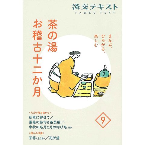 2022年の淡交テキストは毎月の稽古場で出会うモノ、コトから、茶の湯のまなびや楽しみをひろげるシリーズです。《9月の稽古場から》《稽古の準備》では、稽古場風景と「茶箱(月点前)・花所望」の準備を取り上げた上で、それらに関連する「秋に寄せて・重陽の節句と茱萸袋・中秋の名月と月の呼び名・月点前の由来・茶の湯と香・振出しに向く菓子・茶箱の取り合わせ・茶花を育てる・千利休と茶花」について、Q&Aなどで楽しく掘り下げます。その他、当月に活躍する意匠の《9月に活躍する茶道具》や、茶人の日常によく起こる出来事を描く4コママンガ《茶人あるある》、また歌舞伎役者片岡亀蔵夫人・片岡明美氏による暮らしの中の茶の湯エッセイ《まずは一服》「残暑の装いと汗対策」をまじえ、稽古の一助となる充実の内容でお届けします。