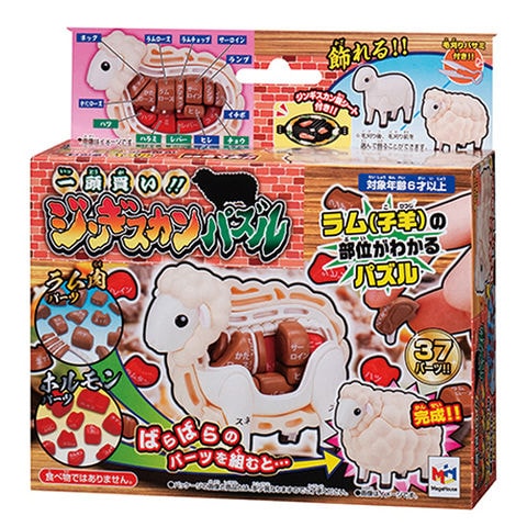 バラバラのパーツを組んでいくと、ラム1頭の姿になっていきます。焼肉で人気のラムのいつも食べている、あのおいしい部分がどこか、がわかる、おもしろパズルです。大人もはまりそう。ジンギスカン鍋シート、毛刈りバサミつき。対象年齢6歳以上。