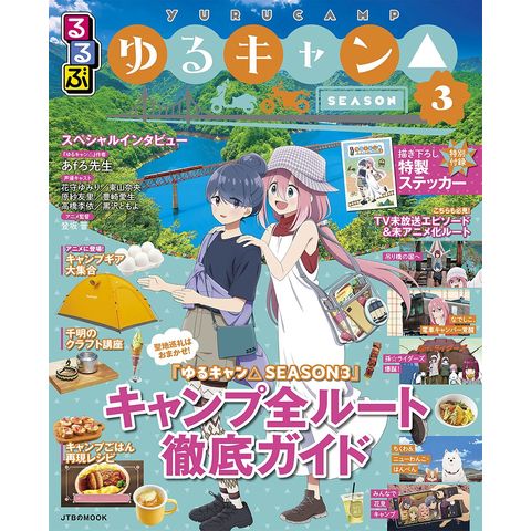 TVアニメ『ゆるキャン△SEASON3』に登場する舞台をめぐる聖地巡礼ガイドです。アニメで登場したスポット紹介をメインに、「るるぶ」ならではのもっと聖地巡礼を楽しめる観光情報や特集をプラス。ほか、スペシャルインタビュー、キャンプギア、キャンプごはんの再現レシピなども掲載します。