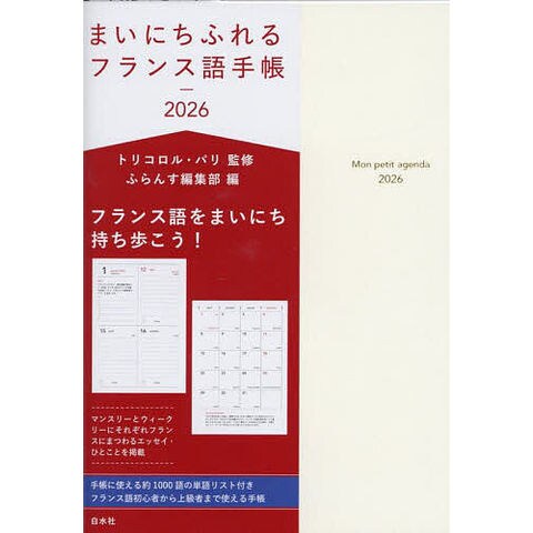2026年はフランス語で手帳をつけませんか。月や曜日はもちろんフランス語で記載。フランスの祝日やその日の聖人名に加えて、折々のフランスを感じられるエッセイやひとことを掲載。まいにちフランスを感じることのできる手帳です。