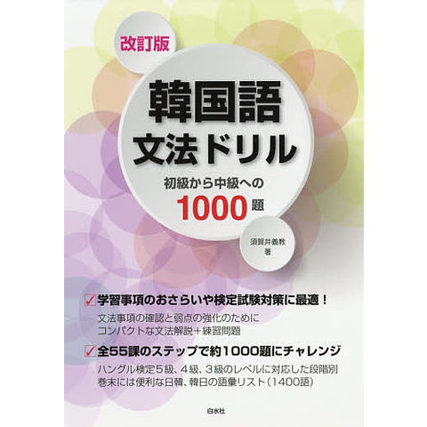 検定試験対策はもちろん、学習した事項をおさらいして自分の実力を確かめるのに有益な学習書です。旧版から聞き取り問題を外して文法問題を充実させ、「文法ドリル」としての性格を強めました。全55課でハングル検定試験の5、4、3級レベルの文法をグレード別にカバーします。各課は見開き2頁で左側に文法の解説と例文、右側の頁に練習問題を配置しています。1課につき20題前後の問題で合計1000題余り。弱点を的確に強化することができます。