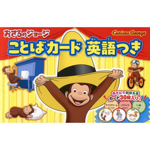 おさるのジョージのイラストで覚えることばカード。カードは安全でかわいい円形です。表にイラスト、裏にその言葉の読み方と英語表記が載っています。